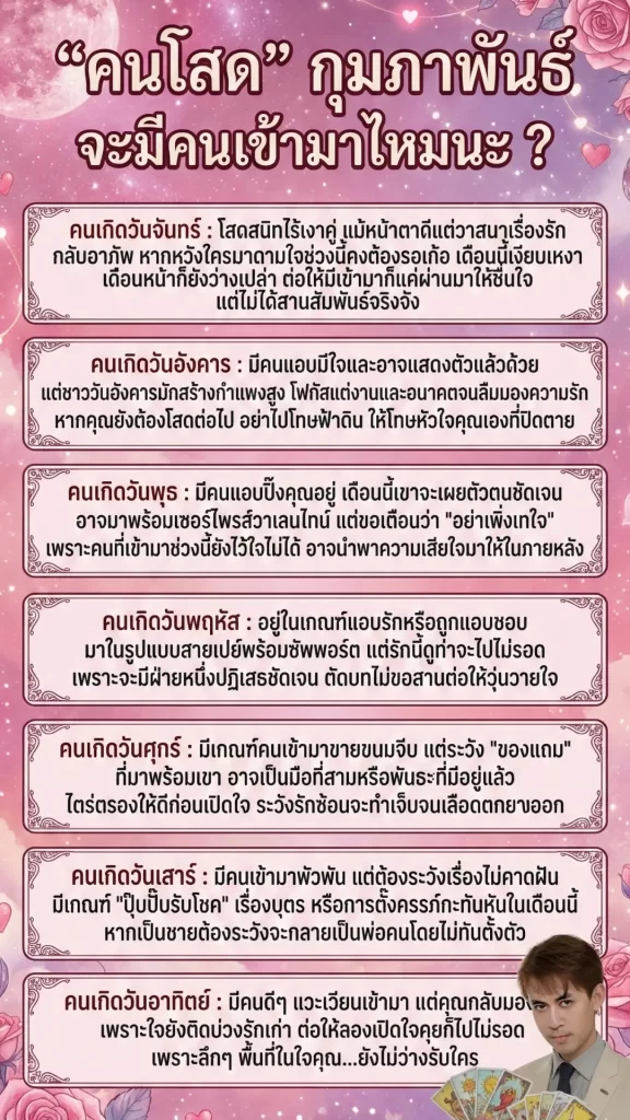 - คนเกิดวันพุธ : มีคนแอบปิ๊งคุณอยู่ เดือนนี้เขาจะเผยตัวตนชัดเจน อาจมาพร้อมเซอร์ไพรส์วาเลนไทน์ แต่ขอเตือนว่า ‘อย่าเพิ่งเทใจ’ เพราะคนที่เข้ามาช่วงนี้ยังไว้ใจไม่ได้ อาจนำพาความเสียใจมาให้ในภายหลัง